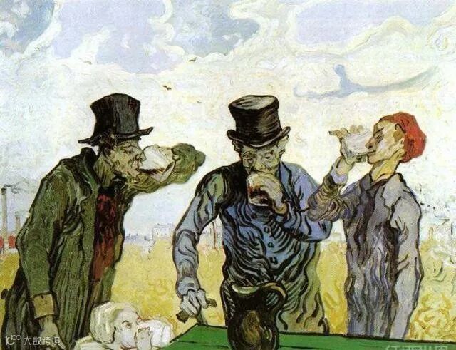 《饮者》是梵高的一幅油画作品,取材自奥诺雷杜米埃(Honore Daumier)的木刻版画。画中描摹的是几个逃避现实的人只顾着一味地喝酒,而且将这种恶习传给了后代,代代循环下去,结果他们及后人都无法摆脱惨淡的命运。不过,由于梵高给这幅画加上了起伏的线条和明亮的色彩,使整幅画的精神看起来并不会显得太过暗淡。