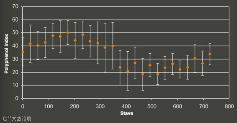 图为未经单宁检测而从两堆桶片中制造出的橡木桶的单宁含量,可以看出单宁含量参差不齐,甚至有一些过低或过高的橡木桶。