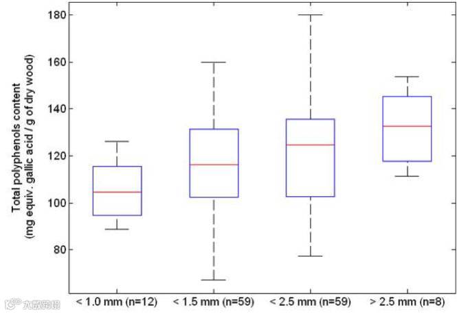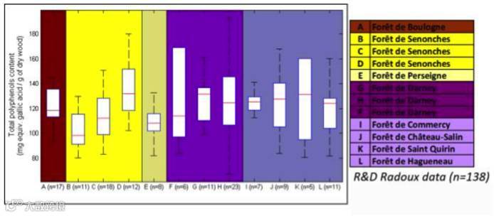 图一从左到右是超超细纹,超细纹,细纹和中纹的多酚含量,多酚是橡木原材料中非常重要的一个元素,多酚有助于葡萄酒的稳定性与抗氧化性,也是衡量单宁的重要数值。图二是分多块森林按照不同纹理的取样调查,和图一一样测的是多酚含量。