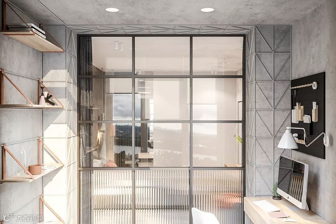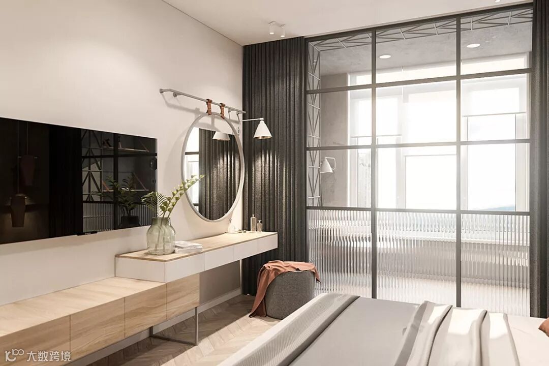 在内部窗户上拉上私密窗帘,就可以阻挡阳台区域过来的阳光,同时也能起到很好的装饰效果,可以让卧室更显舒适与静谧,夜晚在这里安然入睡岂不美哉。在卧室的一角,一个吊挂的梳妆台设置在电视控制台上,产生层叠的效果,也弱化了电视机冷酷的线条。