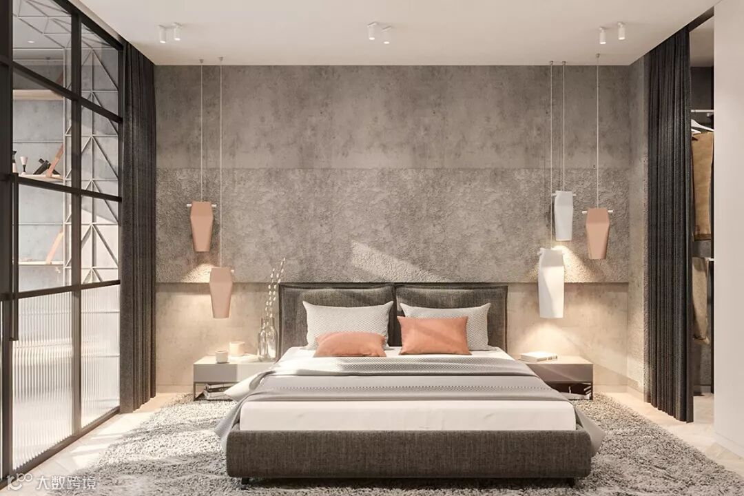 在高级灰为主基调的卧室之中,设计师选用了珊瑚色的物品进行颜色的跳跃与点缀,呈现出含蓄内敛的情感基调时,也为空间注入热烈又不失矜持的活泼气质。成串的卧室吊灯悬挂在混凝土床头板墙上,简单又实用。