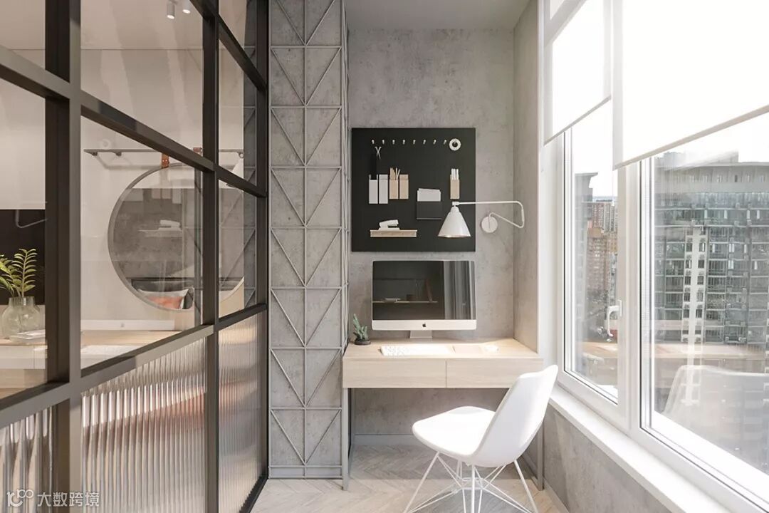 在阳光的沐浴下工作也是一件幸福的事情,封闭式的阳台是一个简易的家庭办公室,明亮的大面积窗户、浅灰色的墙面、暖色调的装饰,让空间变得更加悠闲且暖心。一盏摆臂壁灯照亮了一张简洁的桌子,储物架在对面的墙上,提供灵活自由的储藏功能。