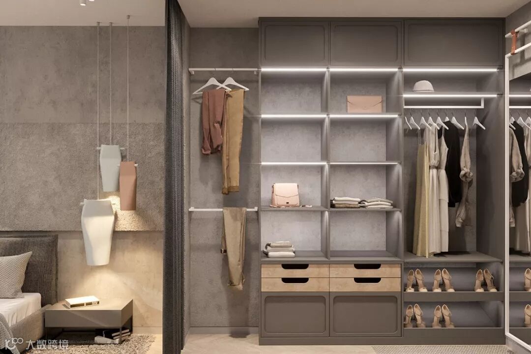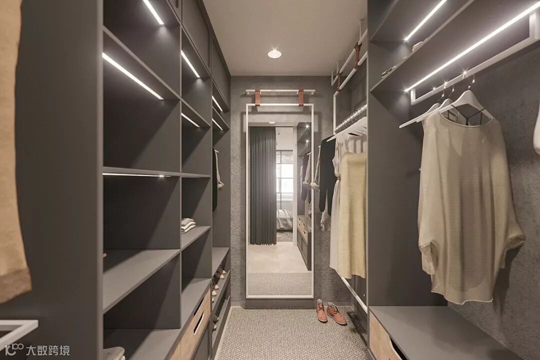 卧室的另一侧有一个步入式衣柜,在设计时就需要考虑不同衣物的特性和尺寸,做到有层次有规则的收纳,本案中通过一个全面的衣柜系统,填满了整整两面墙,储存空间非常完整,衣服可以整齐的陈列出来,存取方便,同时也有充裕的活动空间。