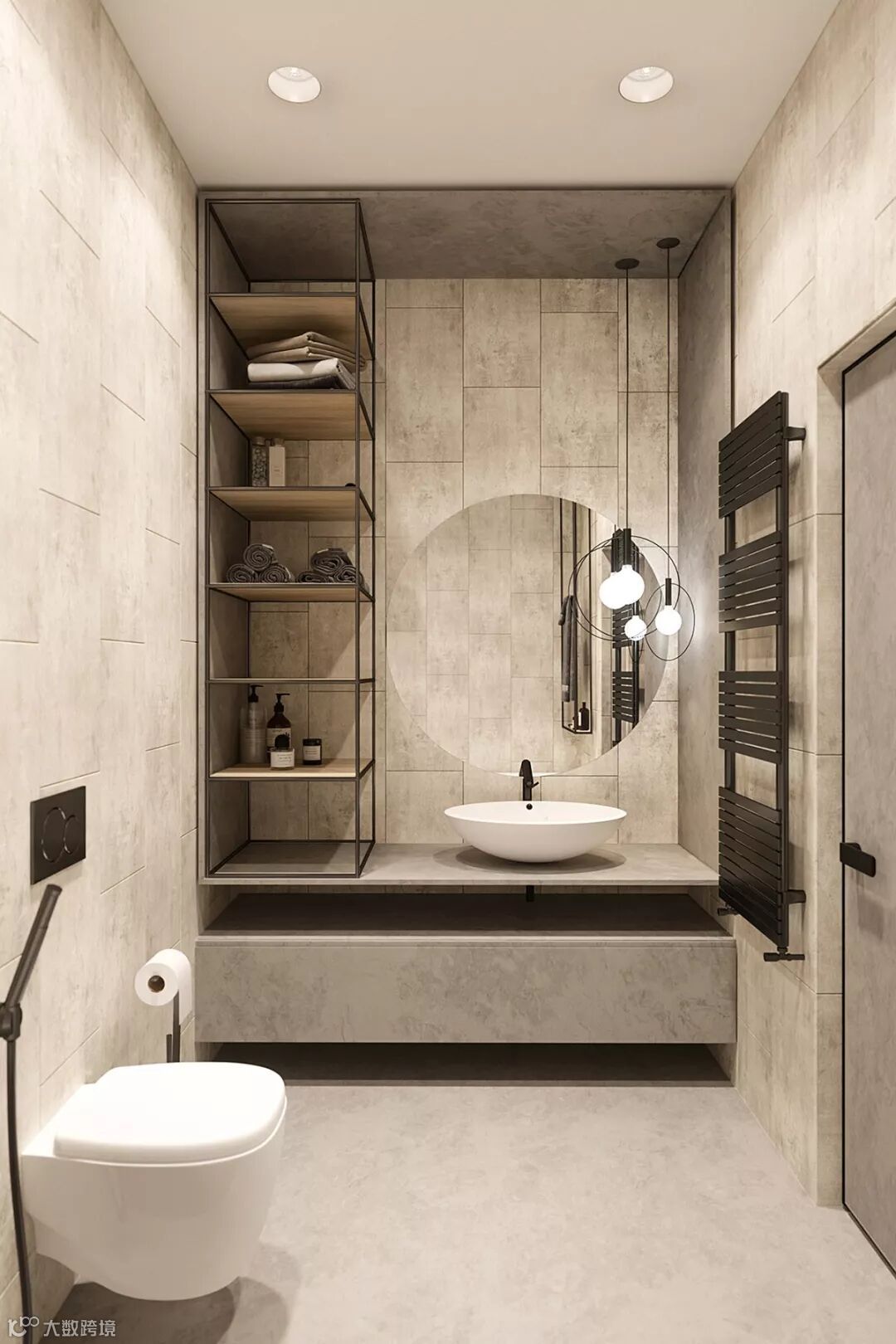 浴室很小,但使用功能很完美,整体在视觉上也非常具有统一性和美观性。黑色装饰勾勒出硬朗简洁的轮廓,圆形吊灯与圆形梳妆镜的形状相互呼应,给人以大气而不失柔和的舒适感觉。