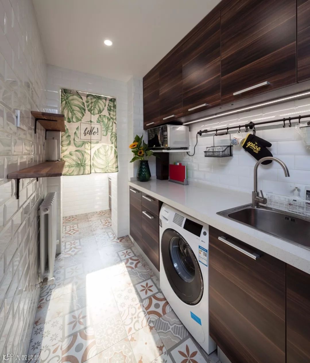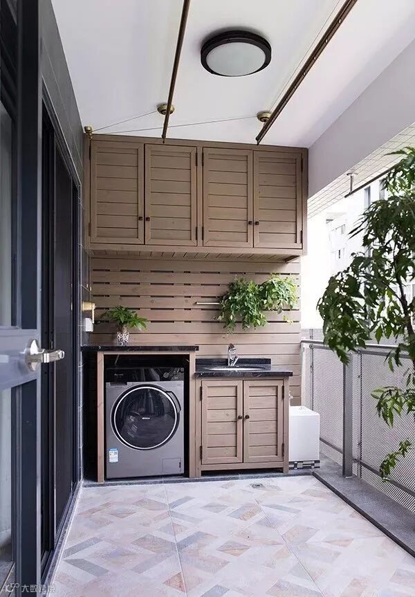 但阳台光线太足,总晒着洗衣机是不是爱坏?这个问题其实不必担心,我们可以根据洗衣机尺寸打造一个封闭式台面或者靠里面放。