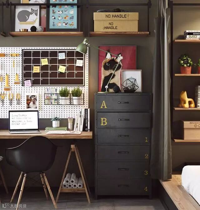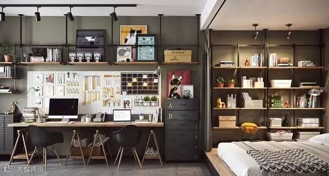 卧室和书房在客厅旁边,整面墙都装满了置物架和洞洞板,摆满了书籍和一些小物件,非常注重收纳,可能看起来有点拥挤,但是空间利用的很好,生活气息也很浓烈。