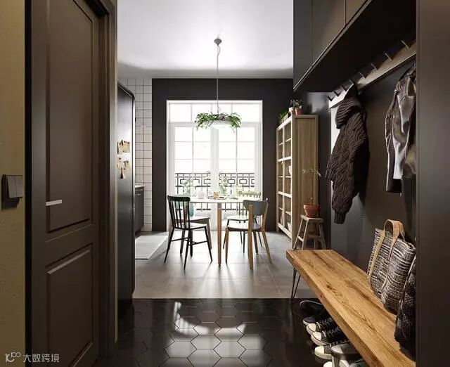 玄关地面铺设的深灰六角砖,呈现出空间的立体感,也作为了视觉区分。靠墙摆放了一张长凳,墙壁上设计了一排挂钩,最上面还打了一排吊柜,满足基本的收纳功能。