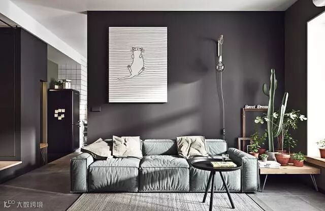 客厅沙发、茶几和地毯,色调上都是和谐统一的,深灰色沙发背景墙非常低调,显得深沉又大气。墙面挂了一幅小猫装饰画,打破沉闷,提升了空间的画面感。