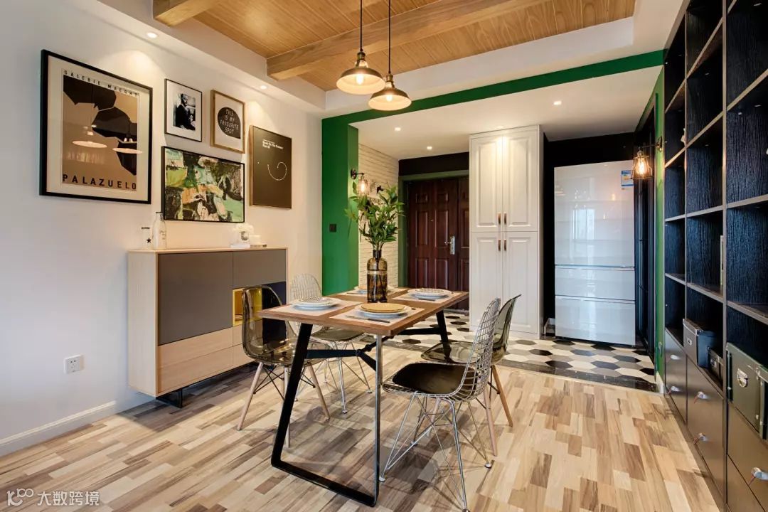 在入户区,灰白黑的六角地砖和米黄色的文化石呈现了时尚、优雅、休闲的格调,同时也实现了与餐厅、客厅之间的层次塑造。鲜亮养眼的森林绿呼应着设计主题,活跃着空间的氛围。