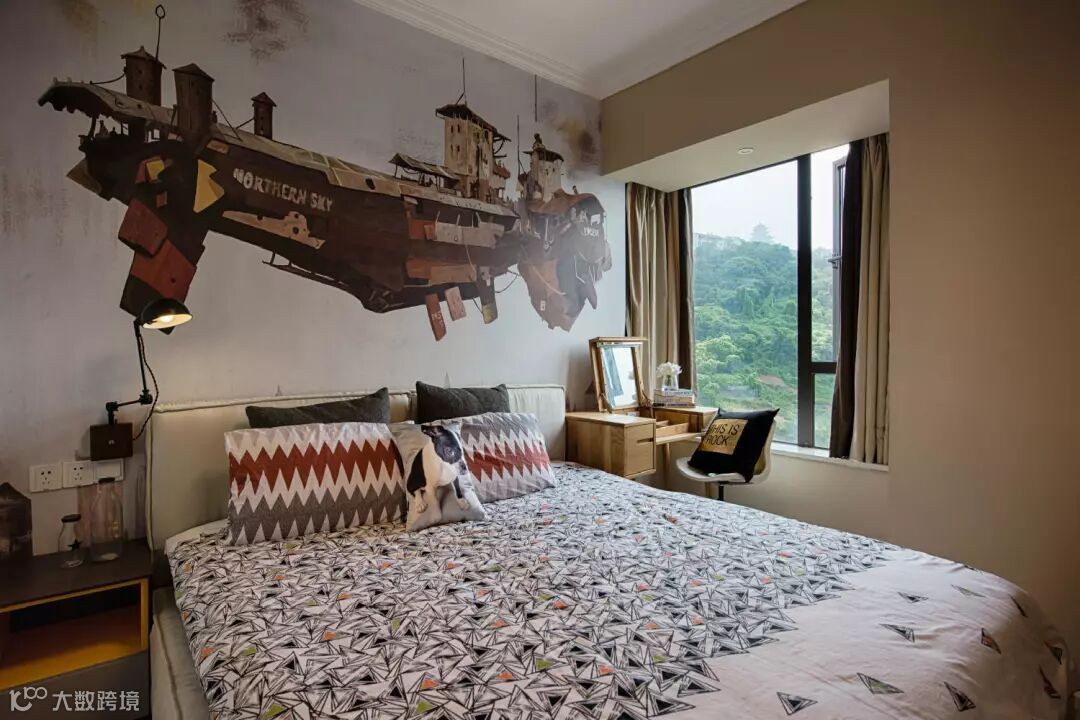 主卧的整体色调不同于其他空间,以棕色为主,橘色、黄色、绿色稍加点缀,营造了欢乐、温馨的氛围。背景墙的图案将人带入到蒸汽风格的梦幻童话里。
