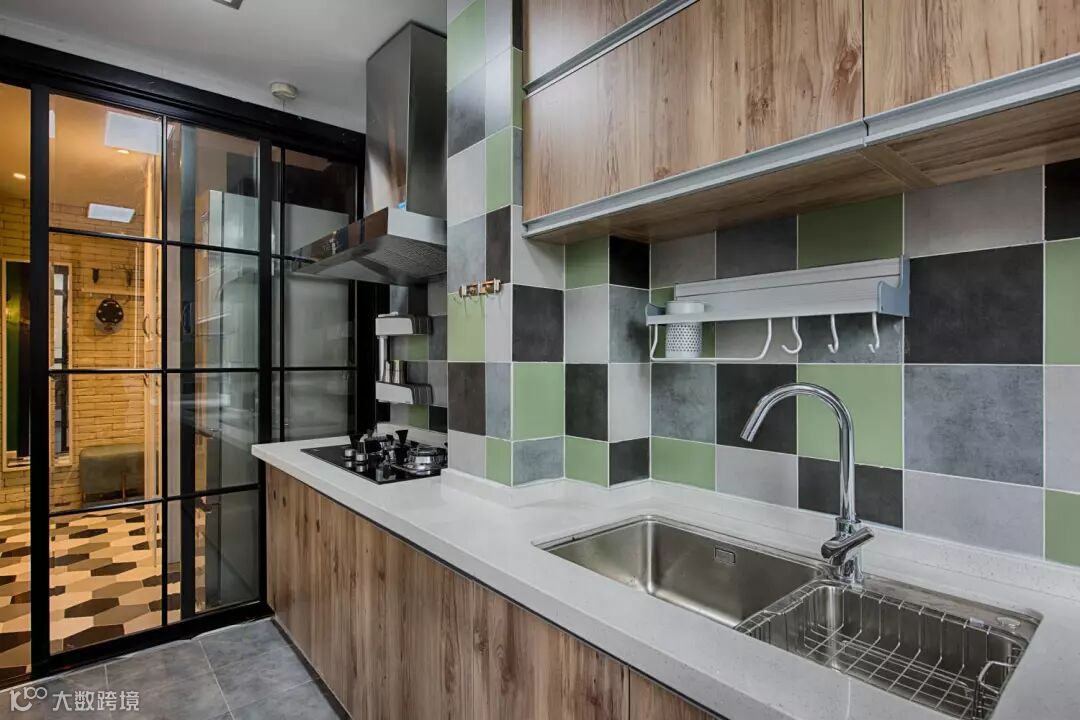 带有“高级灰”色彩的墙砖配合原木色柜面板,让整体质感更柔和,带有几分宁静。