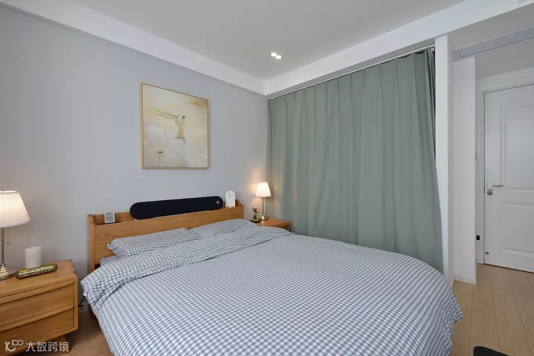 淡蓝色的卧室空间,木质的床与格纹床单,床头中间挂一幅方形装饰画,宽大的木质床头靠背,顶部还能作为展示架。