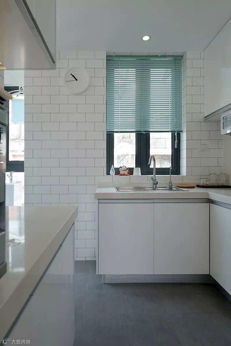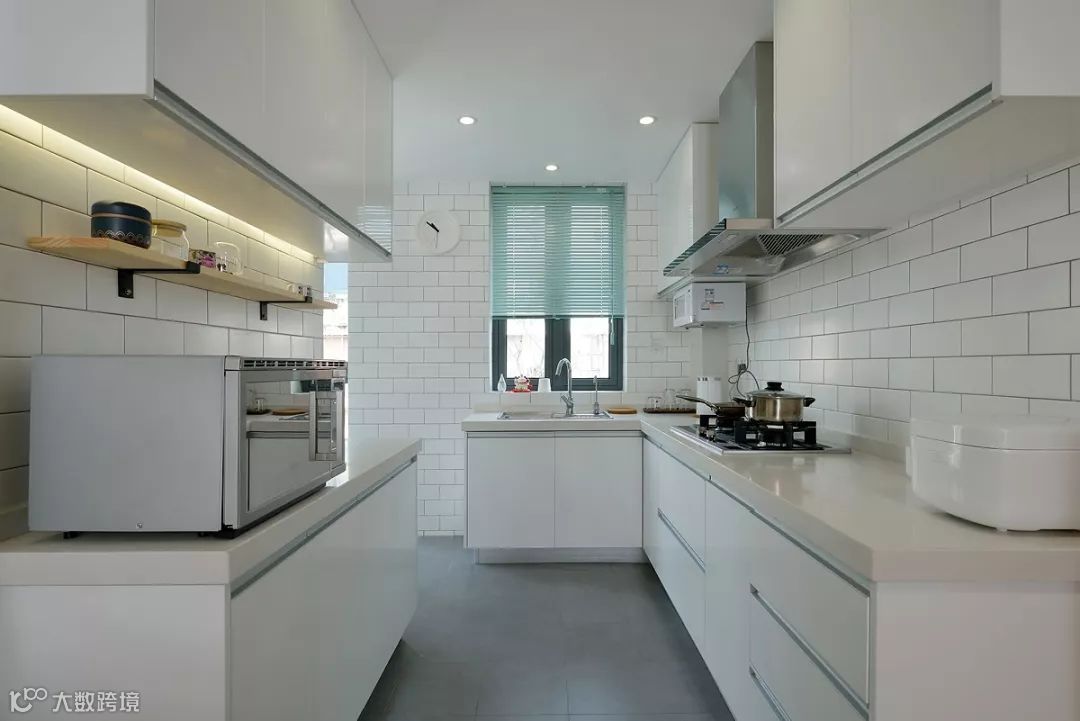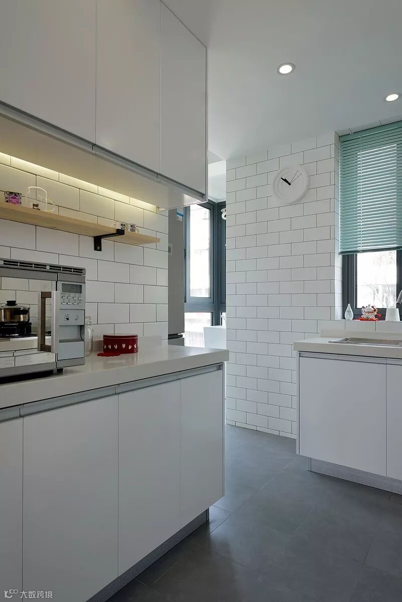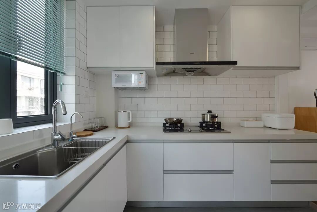 厨房后方还有个小阳台,以1+L字形的操作台布置,实用舒适的厨房以白色橱柜搭配白色工字贴的墙面砖,整个空间都充满了文艺优雅的氛围感。