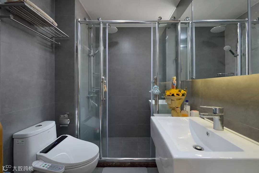 以玻璃隔断作为干湿分离,马桶与洗手盆对向布置,整体设计宽松实用。