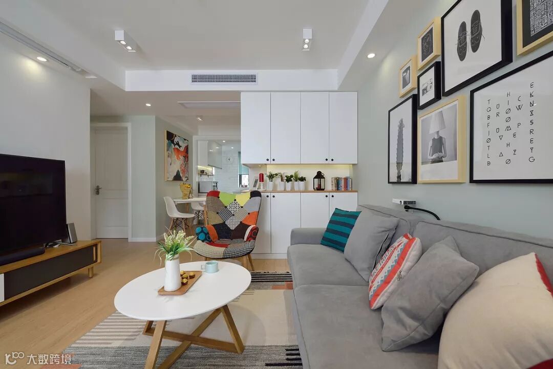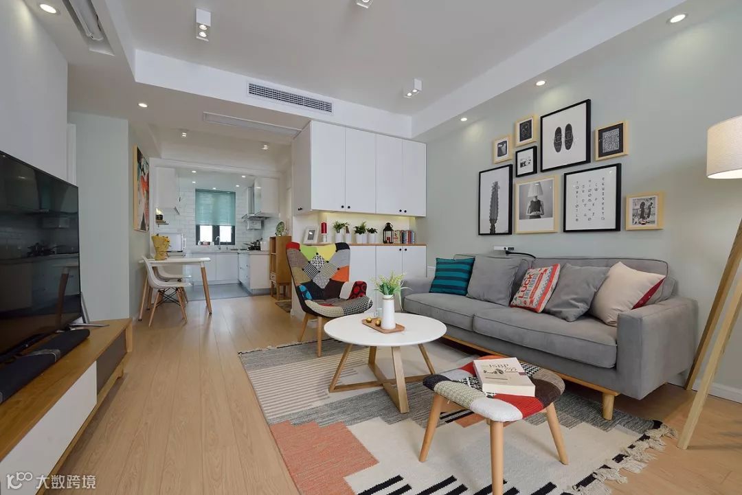 浅灰色的布艺沙发,搭配上彩色地毯与桌椅,沙发墙大小不一的装饰画,带来的是文艺精致的气息。