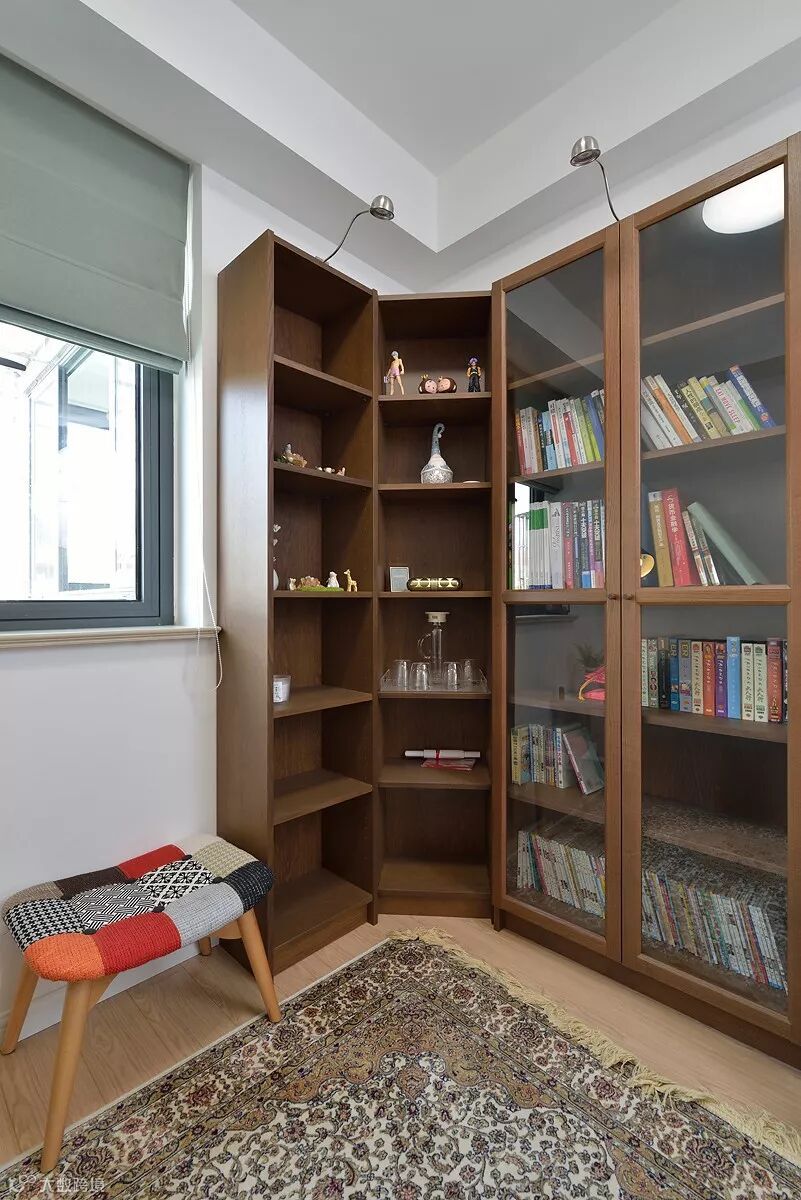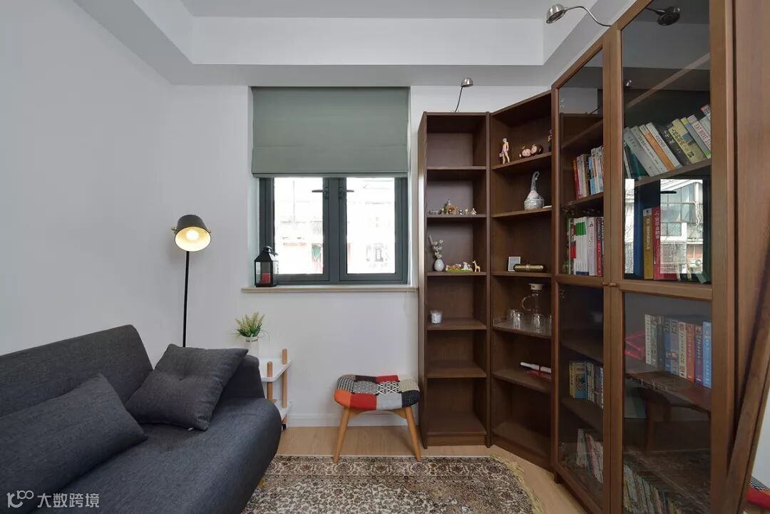 书房摆了一张沙发床,以休闲阅读为主的空间还设置了一个大面积的书架。