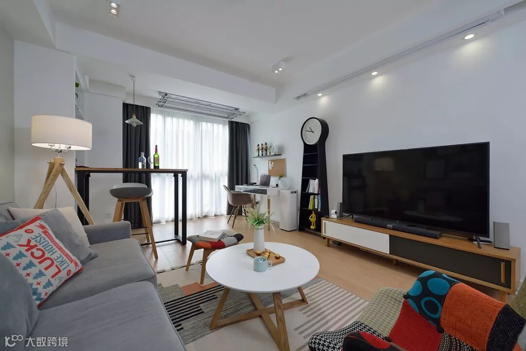客厅阳台打通成一体的空间,显得宽敞自然,布置了书桌与吧台,小小的空间也有着更多的可能。