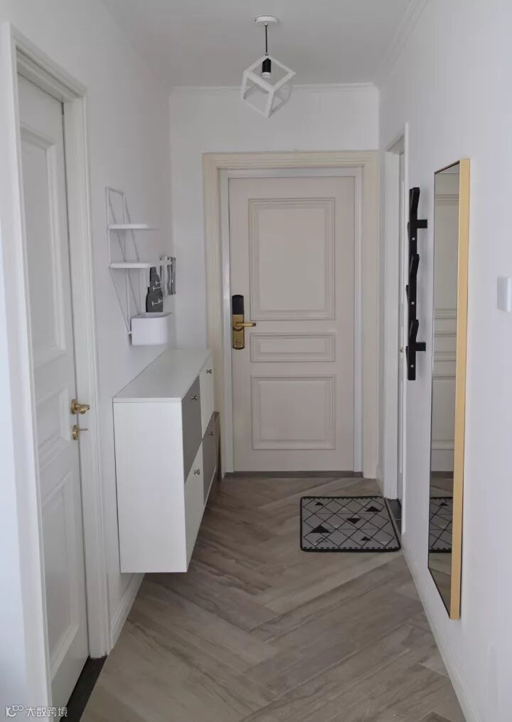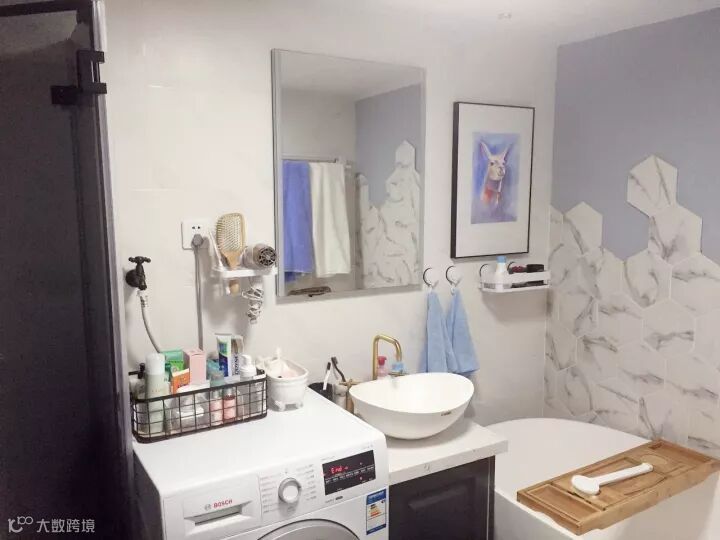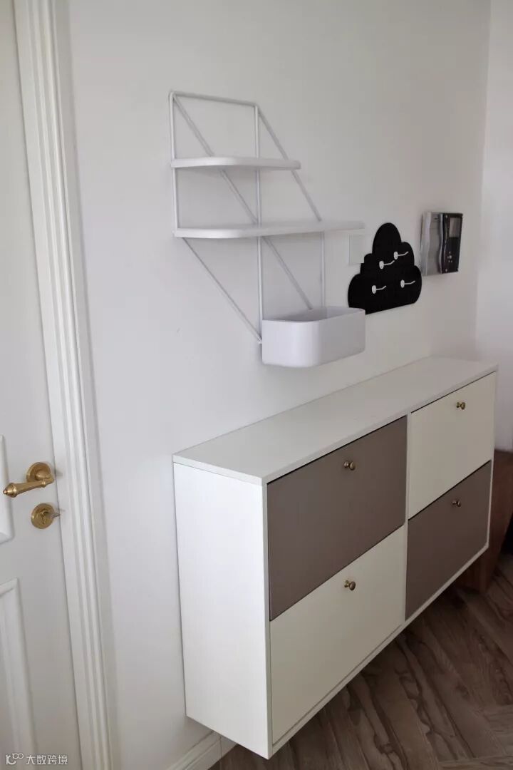 星云置物架和云朵洞洞板,黑白配,看着比较顺眼。鞋柜用了拼色,做成了吊柜,显得空间大一些。黄铜窄边穿衣镜,视觉上灵动秀气。树枝衣架用来挂一进门的外套。瓷砖还是好打理,懒人的福音。