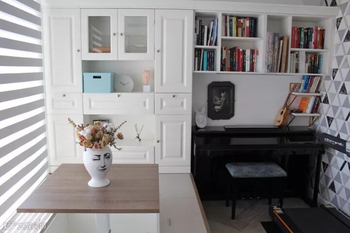 榻榻米延伸出来一个书架,侧面墙贴了大理石几何纹路的壁纸。其实榻榻米没做到顶,最上面装了一个投影仪,对面墙挂幕布,算是书房兼影音室了。