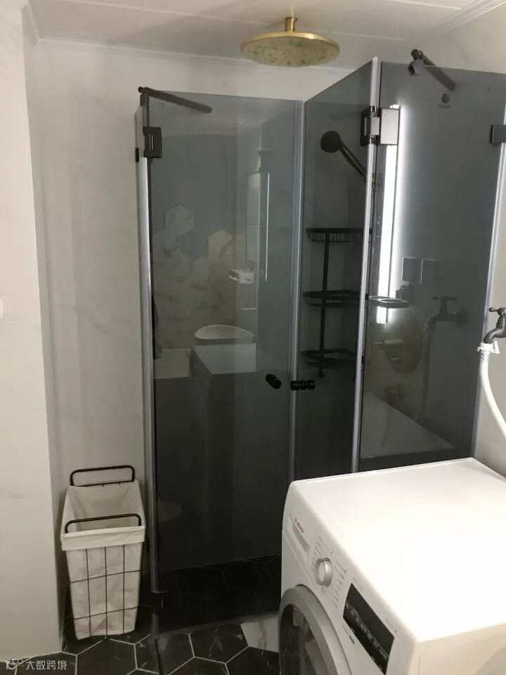 淋浴房是折叠式的,平时两片灰玻向内对在一起,洗澡时再打开,节省了不少地方。左边和墙面还有一竖条空间准备放个搁架单元,把小空间用到极致。洗澡时,把淋浴房折进去的部分推出来,就是一个90×90的常规尺寸,可以看到空间顿时就变狭窄了。