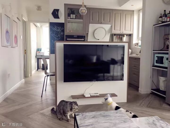 客厅背景墙的设计花了一番心思,因为是北欧混搭法式的思路,简约的基础上也点缀一些欧式元素,比如墙上的线框。建议如果房间不大的话,宽度选窄一点,造型精致一点,气质就出来了。