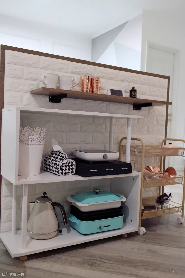 电视墙的背面,因为材质是板材,钉子都在背面,不美观。用立体壁纸贴成文化墙的样子,还摆了一个双层架子和一台小推车,就当餐边柜用起来了。