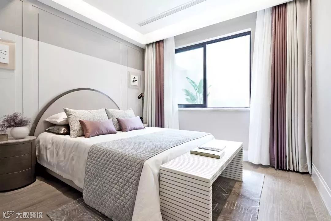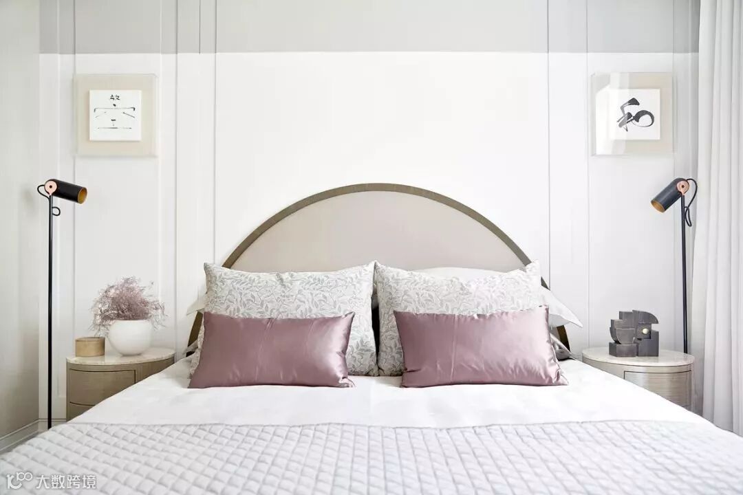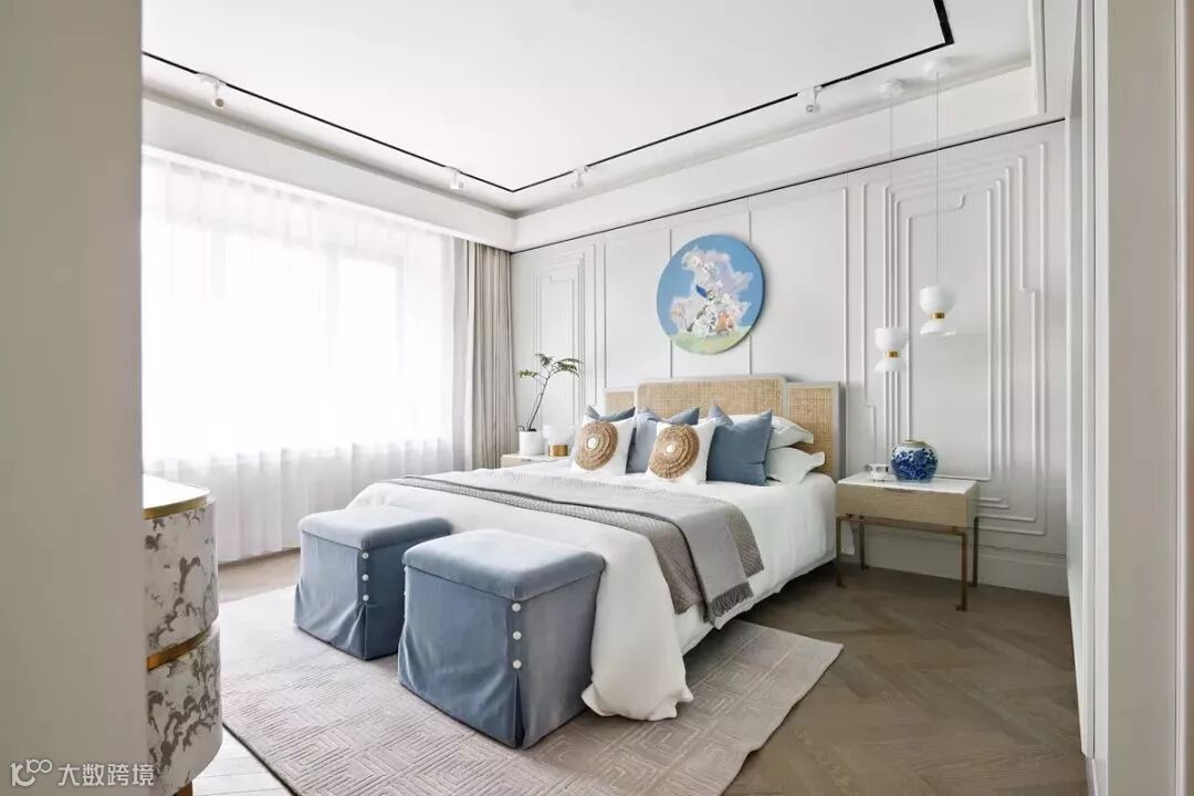 不同于公共空间的精致干练,进入主卧,设计师将优雅格调以温润素白的主色诉诸于人的知觉,以奶白色系为基础,以金属描边质感家具,搭配优雅蓝主色,彰显出法式风格的华贵气质。