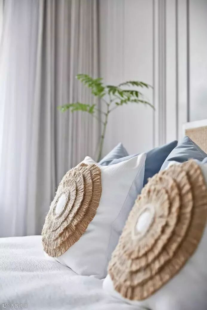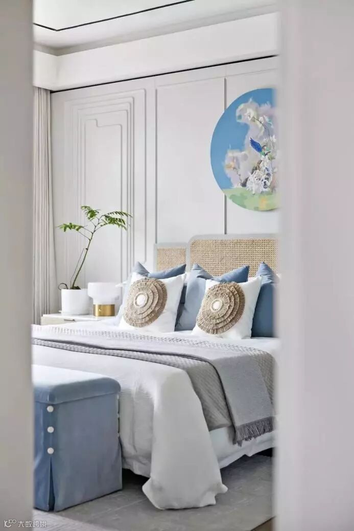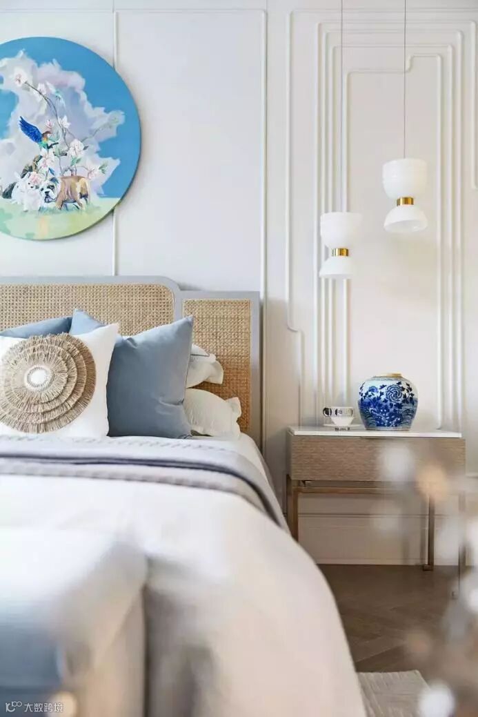 藤编元素的床被与靠背柔和着空间,坐榻的设置让衣帽间兼顾收纳的基础上更加人性化,壁画也是以简单而不简约的线条营造意境舒适感,设计师淘回的青花瓷与当代艺术家器皿对比,柔和了氛围。