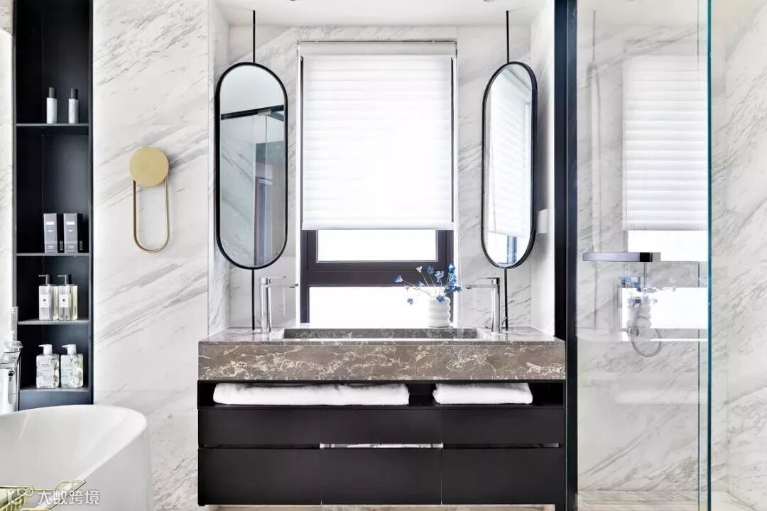 主卧卫生间功能区域干湿分离并,且设置了双台盆和浴缸,增加空间的仪式感的同时更注重功能性。以自然纹路的大理石与黑色搭配出时尚质感。