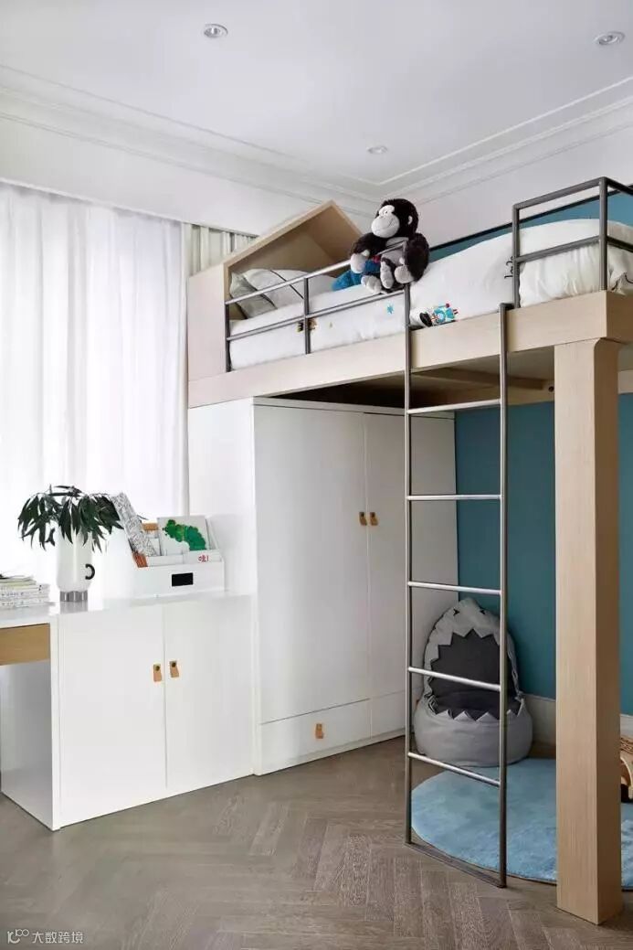 男孩房则以一位热爱运动,喜欢攀岩的小主人公,设计了二层空间的睡床,床下则是衣柜,增加了活动空间,符合男孩的好动冒险性格,木色的一面墙壁挂满奇形怪状的攀岩器具,满足男孩子的日常爱好;而另一侧满足男孩子的丛林好奇心。几何图案的复古椅又给予空间质感。