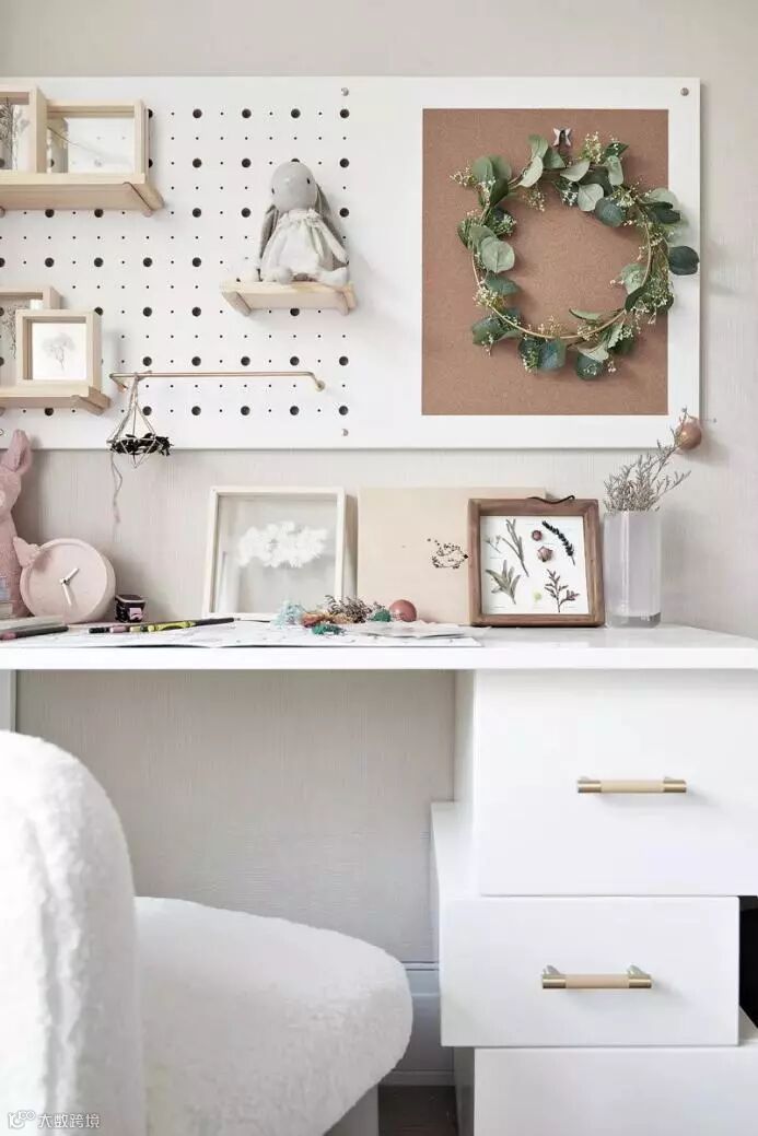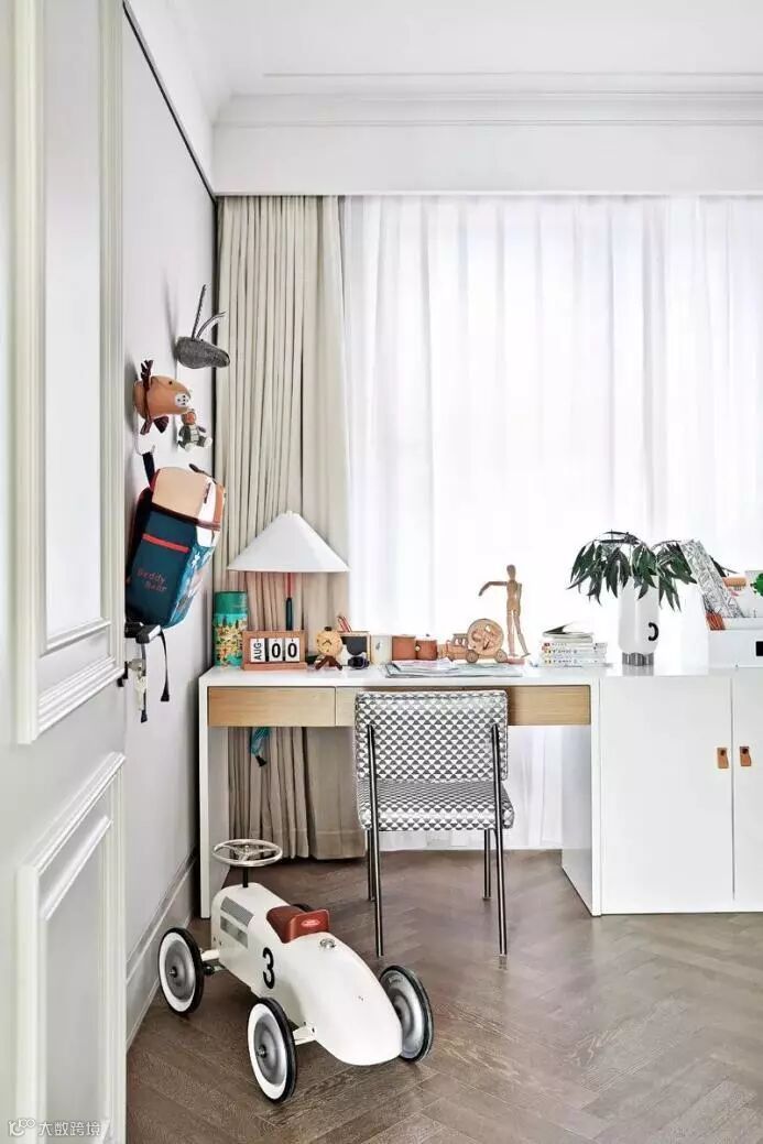 整个房间犹如丛林中的小城堡,植物主题,小主人公热爱植被喜欢手工标本,符合空间气质而加的有跳跃感的小灯泡缠绕,干净的白色为主,加以木色,动物的小摆件活跃着空间氛围。丰富的材质和图案,为孩子打造一个多元化的空间。