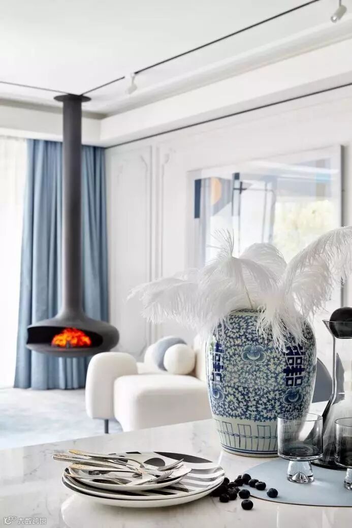 老物件的陶瓷瓶有着古老典藏的低调质感,与呈现法式优雅的艺术家餐具碰撞出不经意的火花,同色系的空间蓝也体现着设计师的浪漫情怀蔓延至此间,艺术情趣在空间里自然而然的融入。一半现代,一半怀旧,起承转合着复古之美与现代轻奢的时尚腔调。