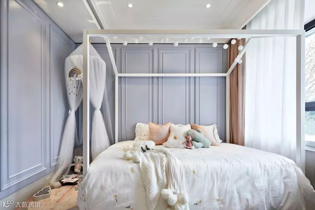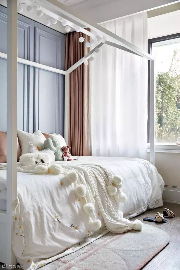 女孩房的空间更主要的是打造成一个想象的世界。设计师设置主题背景提高空间趣味性,营造一个在符号、形式面前更强调孩童身心感受的世界,以孩童世界感知空间美学,设色上明快、灵动,充满童思遐想,将空间构成成孩童富饶无垠的精神世界一隅。