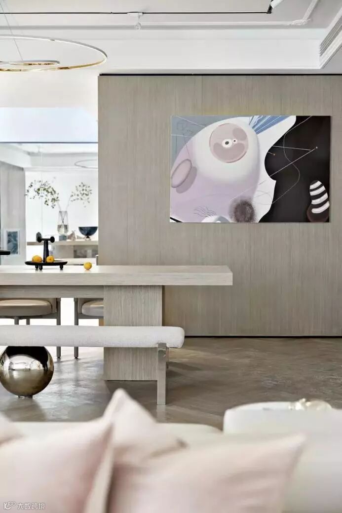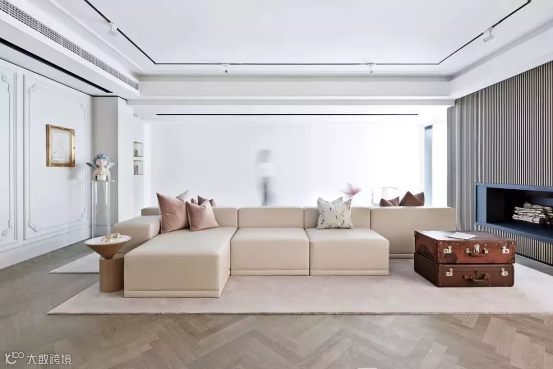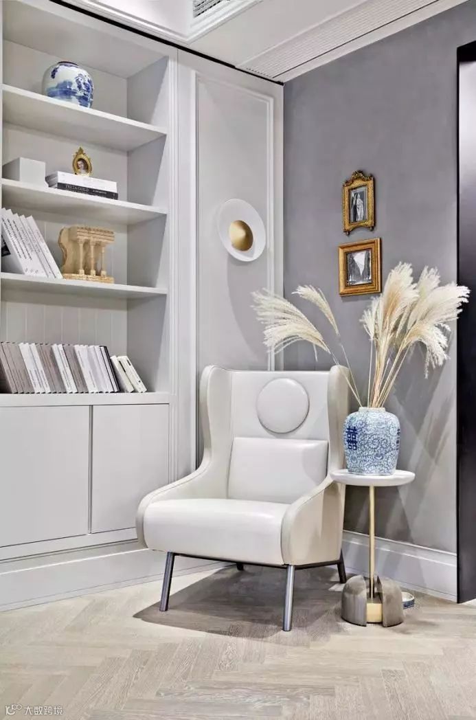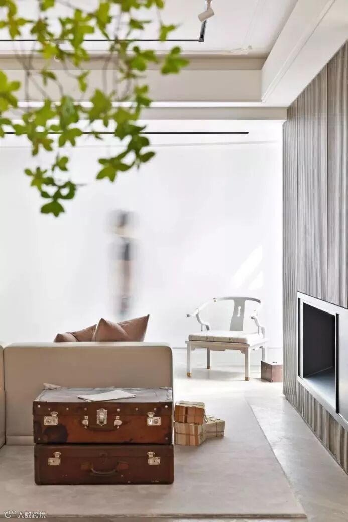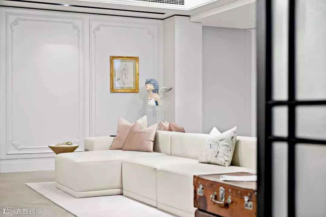 设计师精心收藏的老皮箱旧物新用,作为茶几的功能性点缀着空间。青年艺术家的诙谐美好的艺术雕塑那一抹静蓝呼应着空间主色,金属画框的人物素描,与不经意的粉色系点缀小品共鸣出温馨。