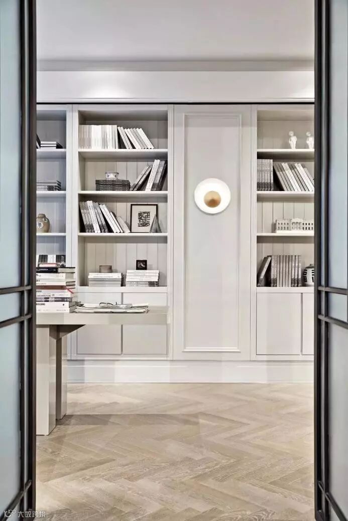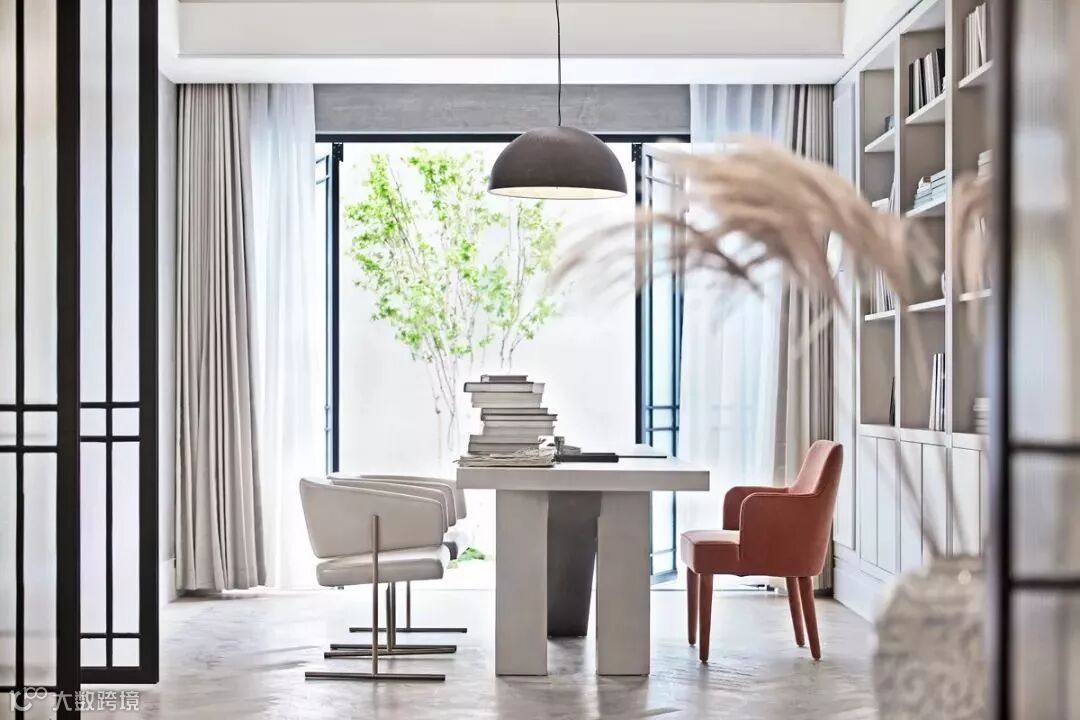 书房模拟一位建筑爱好者设计的空间,书柜也以此为基础呈现,放置着各式各样的建筑书籍与建筑模型,桌椅也选用有着建筑线条感的形状,设计师以精神性的总体感觉把控空间规划,在理性的简明中觅得灵魂的舒张,借以艺术的力量丰盈空间气韵。