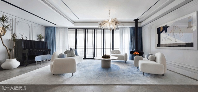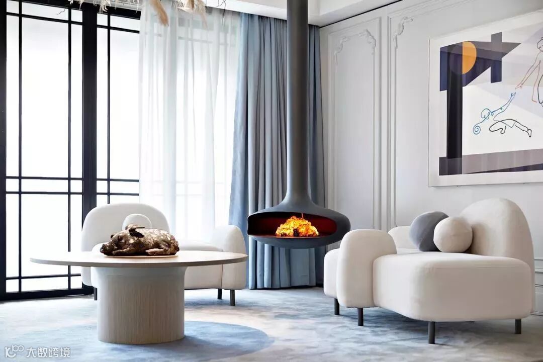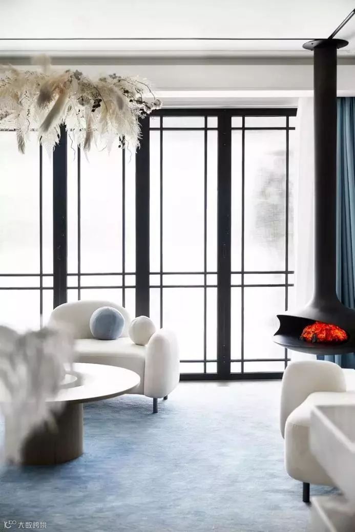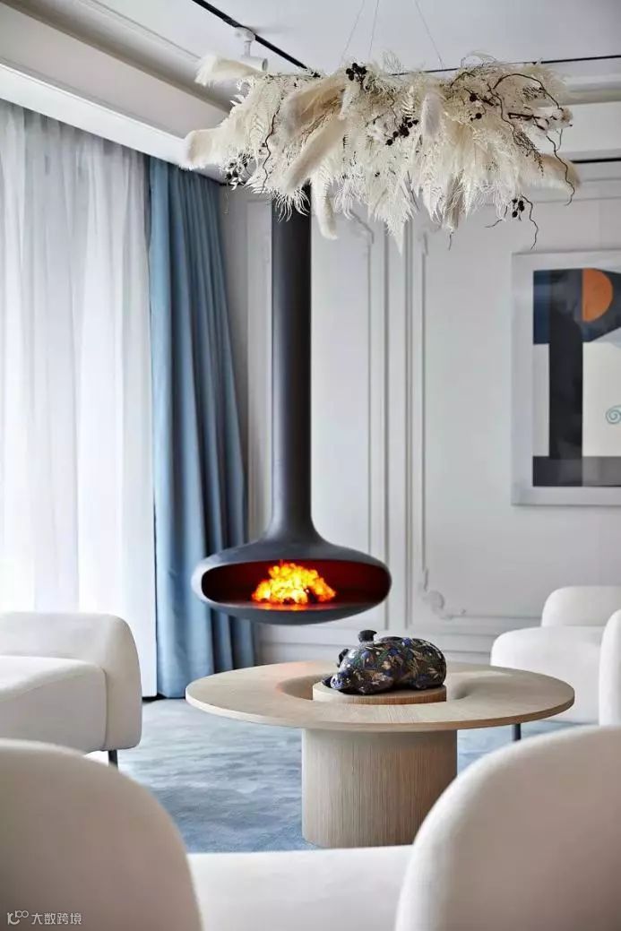 客厅空间设置吊挂壁炉,仿佛呈现出家庭聚会的生活情景,而增添美好的生活仪式感,也使空间更加生动富有层次。