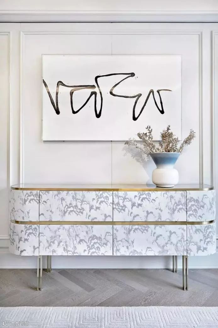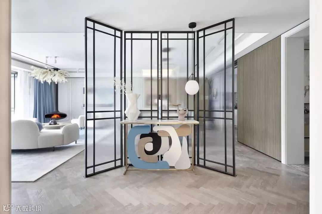 入户玄关处,通透的玻璃屏风打造一个艺术小空间,主题颜色的不规则木艺勾勒出静止却灵动感的画面,桌子上的原版艺术家雕塑,椭圆的灯光,白色的瓷瓶与星点的小植被,会讲故事的设计师得心应手以材料与色彩营造空间氛围。