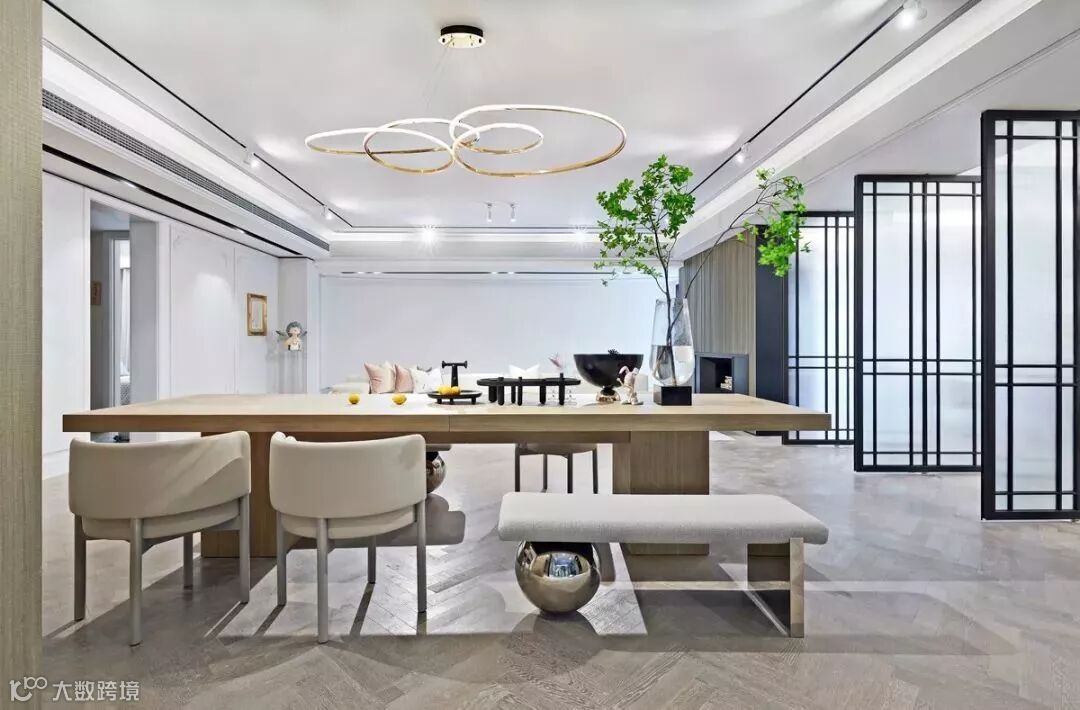 客餐厅空间运用室内外景观相融合的设计理念,改阳台推拉门为折叠门,将室外景观资源最大可视化,在各空间的界域相接处,空间与空间相通相融的同时,使空间风格更具有统一和谐的装饰性,进而营造一种感性、超然的生活样式浮现眼前,自由惬意。