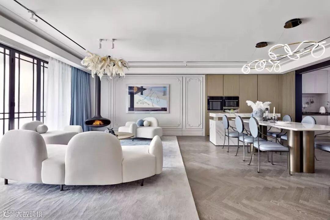 雅士白岛台、餐桌,原木木饰面,清新蓝色餐椅,金色框架随性缠绕的白色灯饰给予灵动感,把客厅、餐厅、厨房以及吧台多功能一体设计,简约而又不失创造力和对实际需求的细致考虑。
