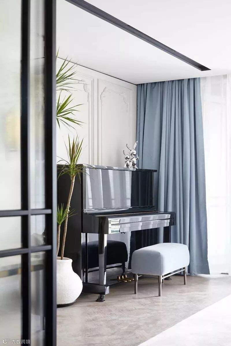 乐器是感受生活之美必不可少的陪伴,客厅的一角是音乐的空间,钢琴上放置的艺术家摆件也说明着主人翁的生活态度,同色系的蓝色钢琴椅舒适慵懒,金属色的墙饰呼应钢琴的下方,淡蓝色的窗帘、白瓷的落地瓶、自然的植被,一副和谐的舒适美感。
