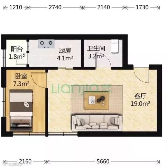 跟厨房之间只用了个吧台隔开来的就是客厅的位置了