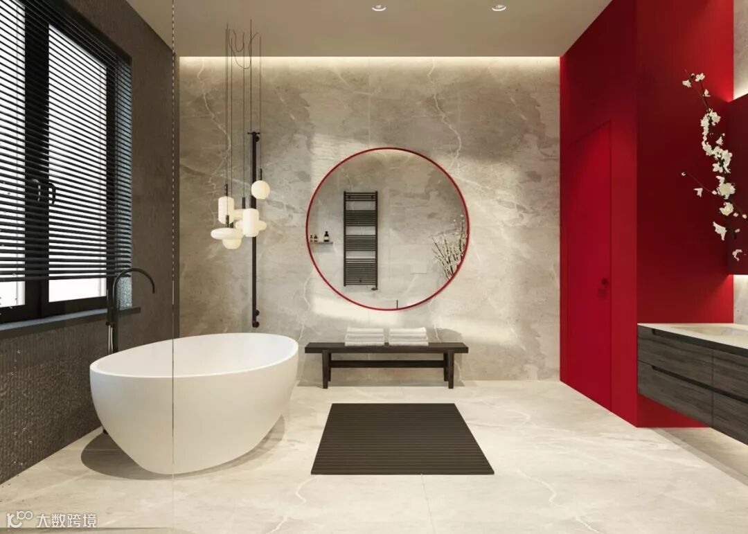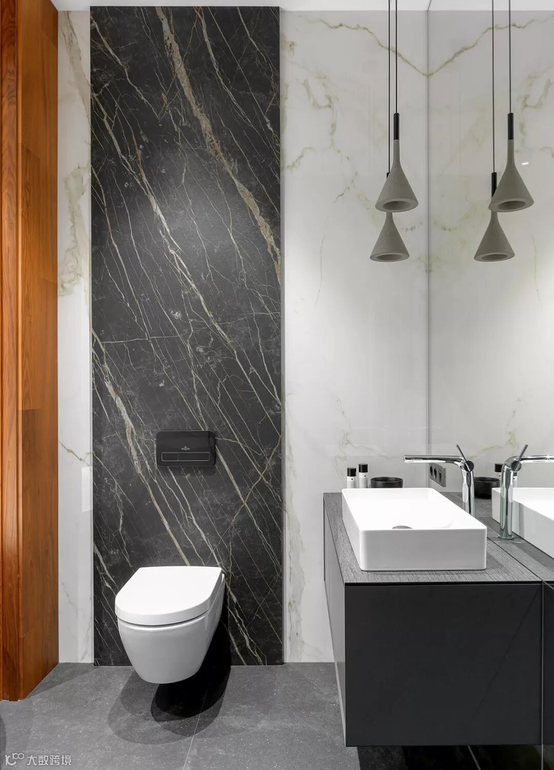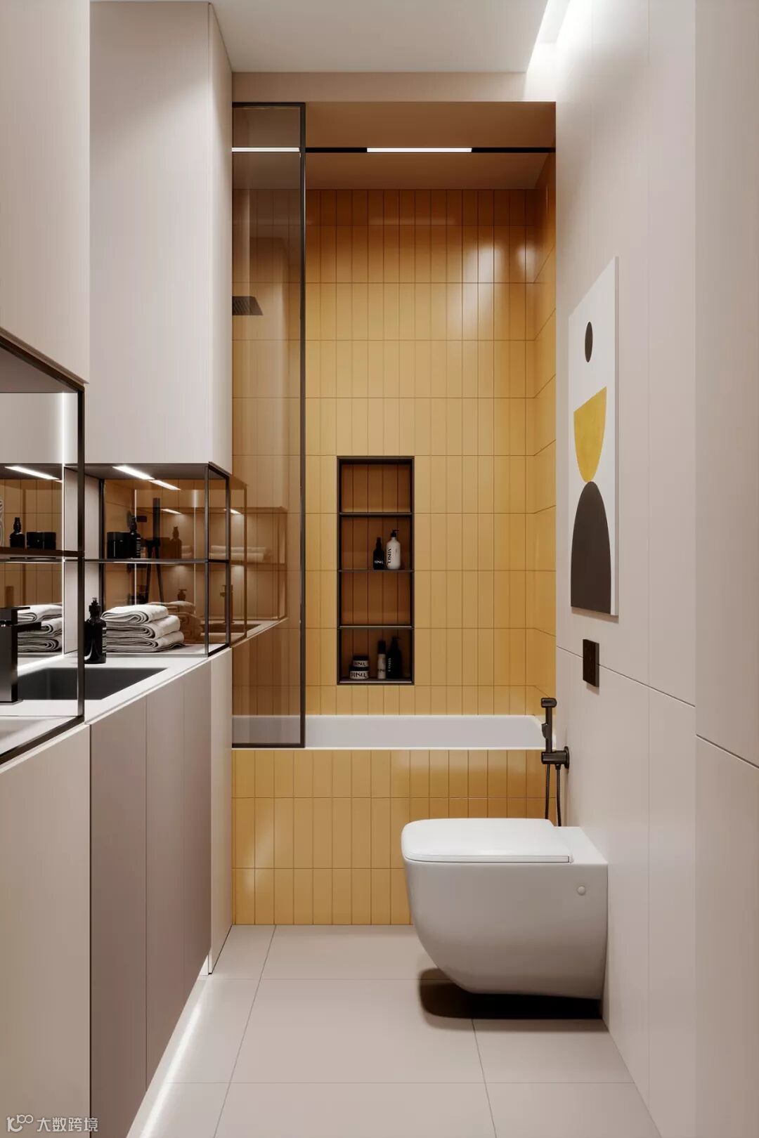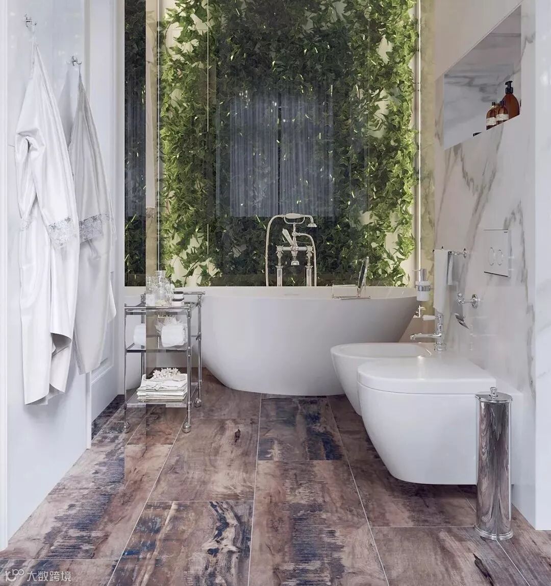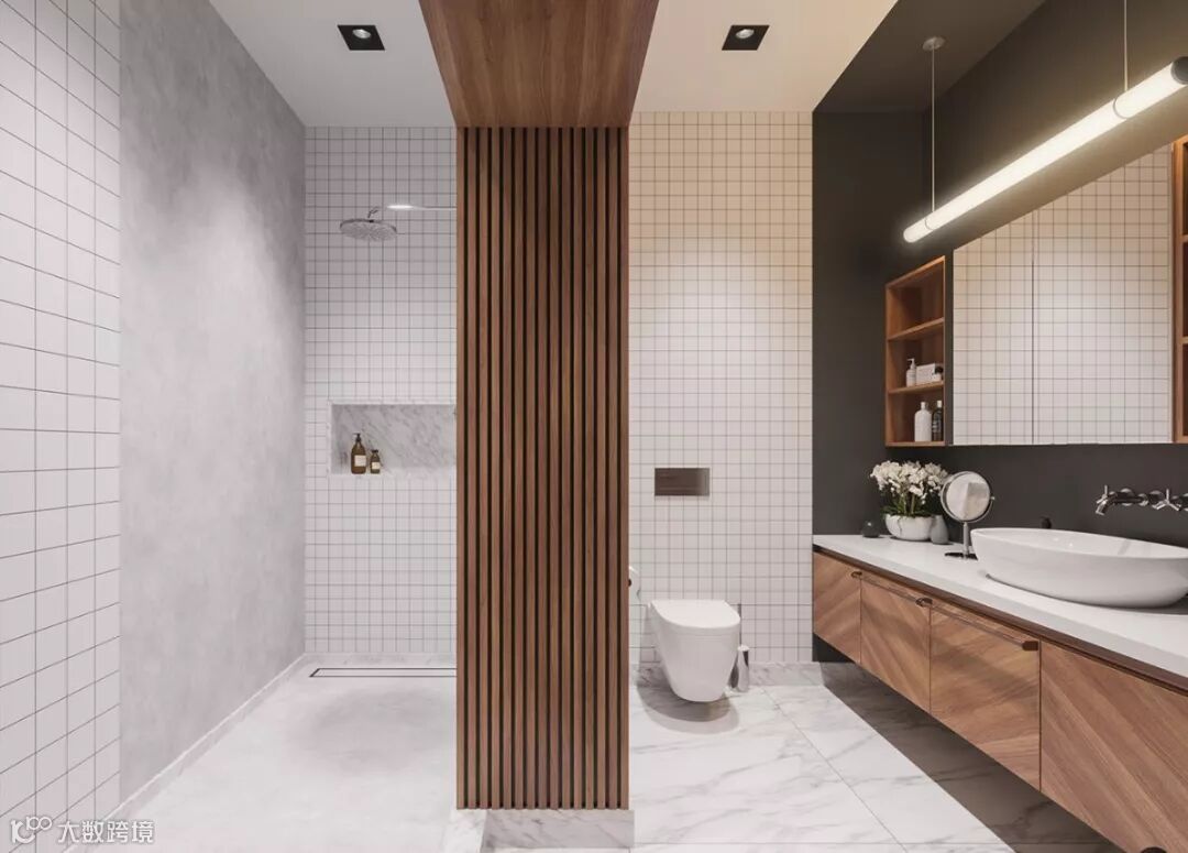一般色彩会给人先入为主的既视感,所以要想提高卫生间的格调,可以从空间里占地面积最多的墙面来入手。
