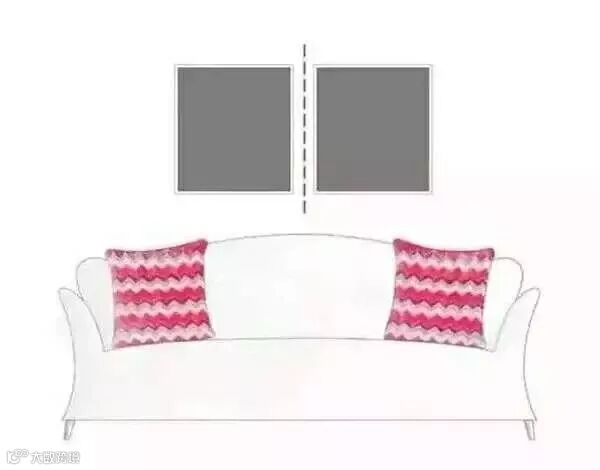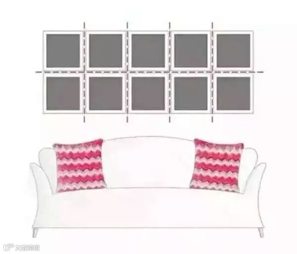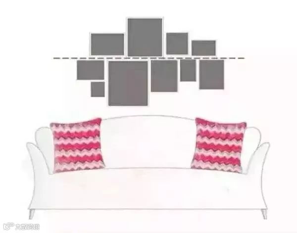 这种挂法简单易操作,也是我们最爱用的挂画方式,以沙发为参考物,找好中心点,图片的选择,最好是同一色调、或是同一系列的图片,效果最好。