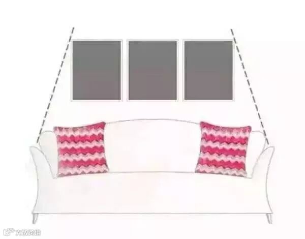 三幅装饰画在同一水平线上,挂画的总宽比被沙发略窄,并且均衡分布。图片建议选择同一色调或是同一系列的内容。
