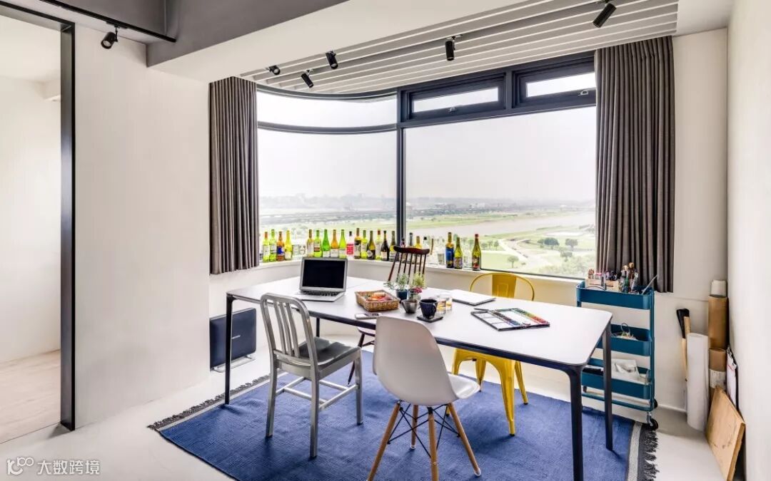 餐椅的颜色、款式和风格完全不一样,酒瓶摆在了窗台上,很有艺术感,就像是一幅画一样。