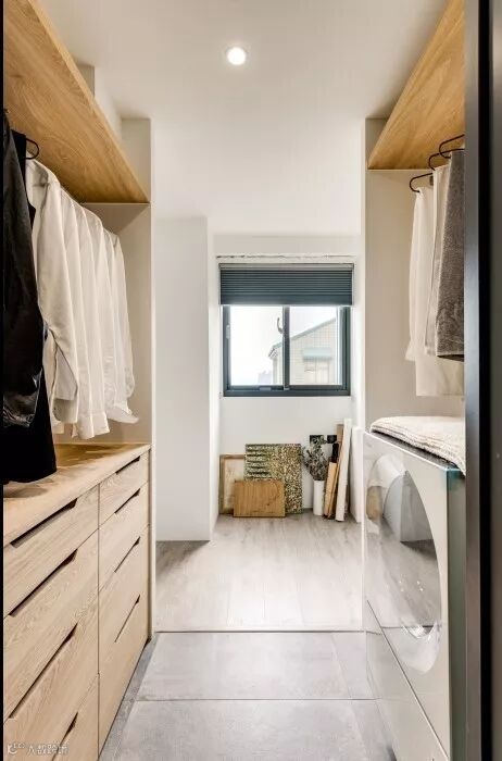 衣帽间相对来说也比较宽敞,滚筒洗衣机干好放在这个空间里,衣服的换洗也非常方便。