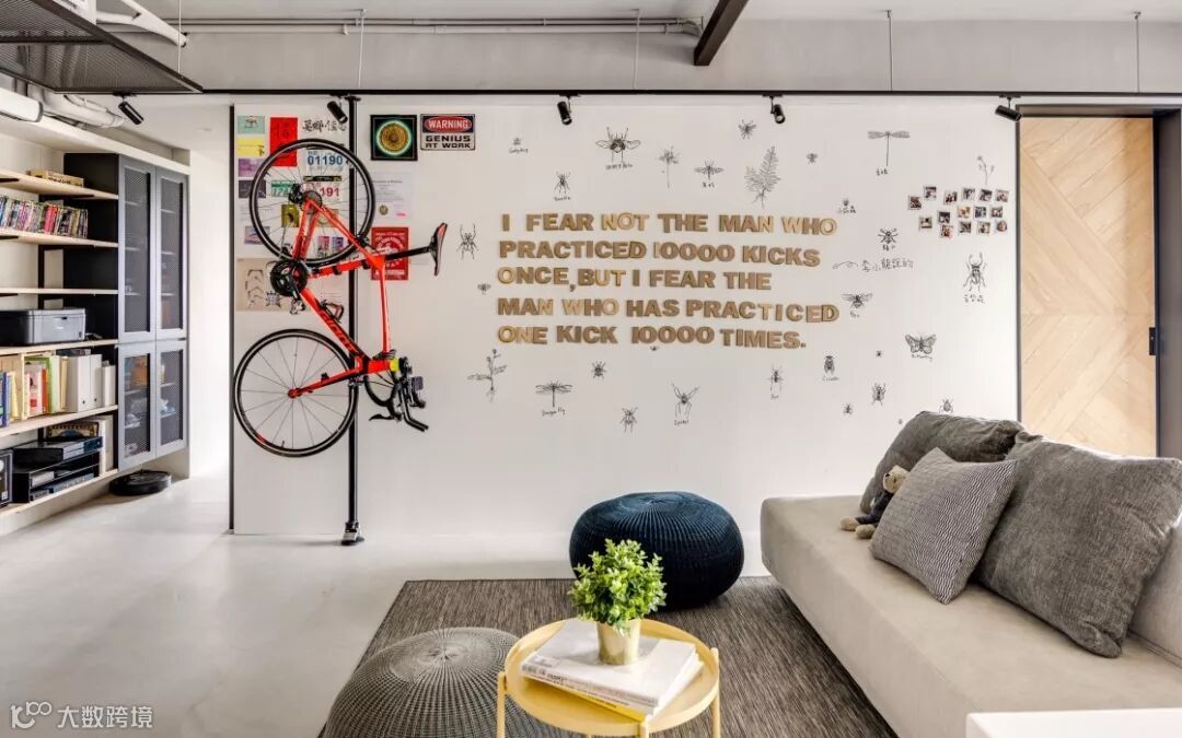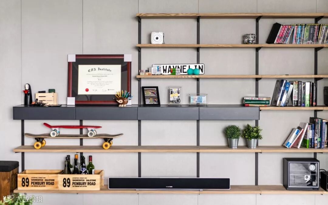 走廊的墙壁也完美地利用了起来,设计一些开放式的搁板,放置书籍、小摆件、收藏品、相册、小盆栽等等,不仅合理地利用了空间,还为原本单调的走廊增添了情调。