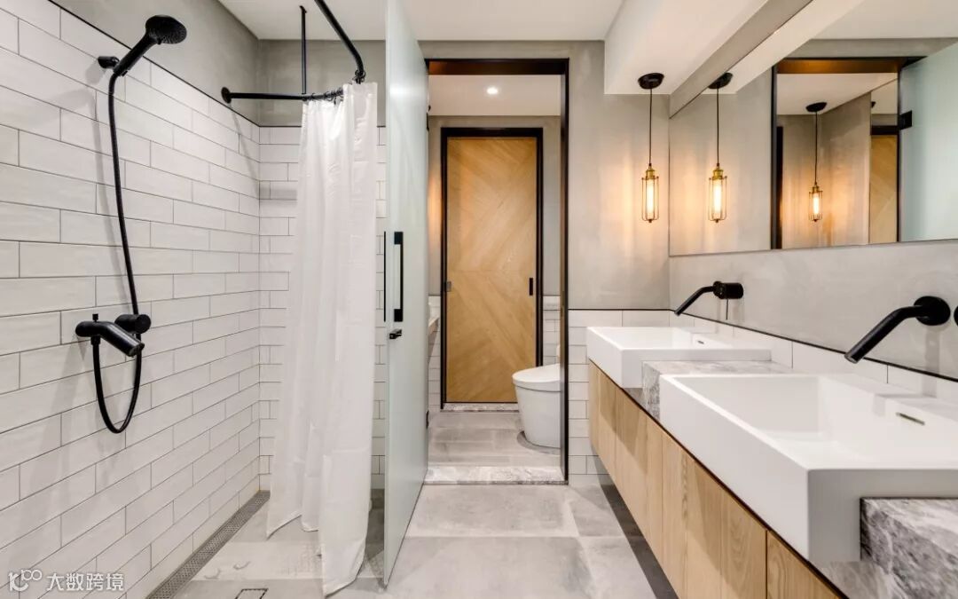 卫生间相对来说还是占面积比较大的,双人位的洗漱台,狭长的淋浴空间,用白色的浴帘将两边分隔开。