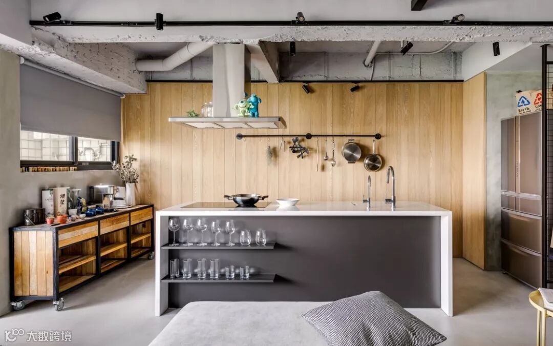 开放式的厨房布局非常对称,工业风设计,靠阳台的一边有一个可以移动的收纳柜,吊灯上面还可以放置一些透明的玻璃杯。