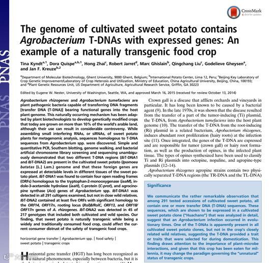 2015年5月《美国国家科学院刊》上发表了一项研究,它表明人类作为主要作物之一的红薯,其实是在自然条件下转了基因的食品,且转入的还是一种叫做“农杆菌”的细菌强行植入的外源基因。